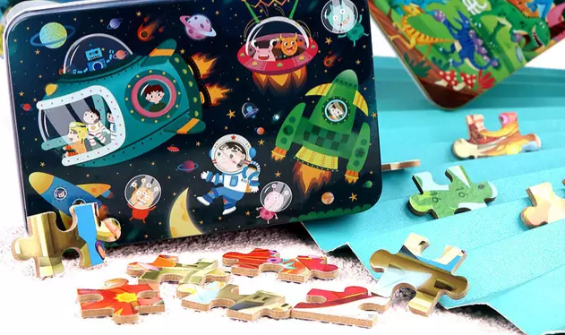 Roligt Astronaut barnpussel. Älskar ditt barn också astronaut? Då är detta pussel perfekt eller kanske vill föredra en sjöjungfru och en dinosaurie. 3 olika motiv att välja mellan Dinosaurie, sjöjungfru eller astronaut.